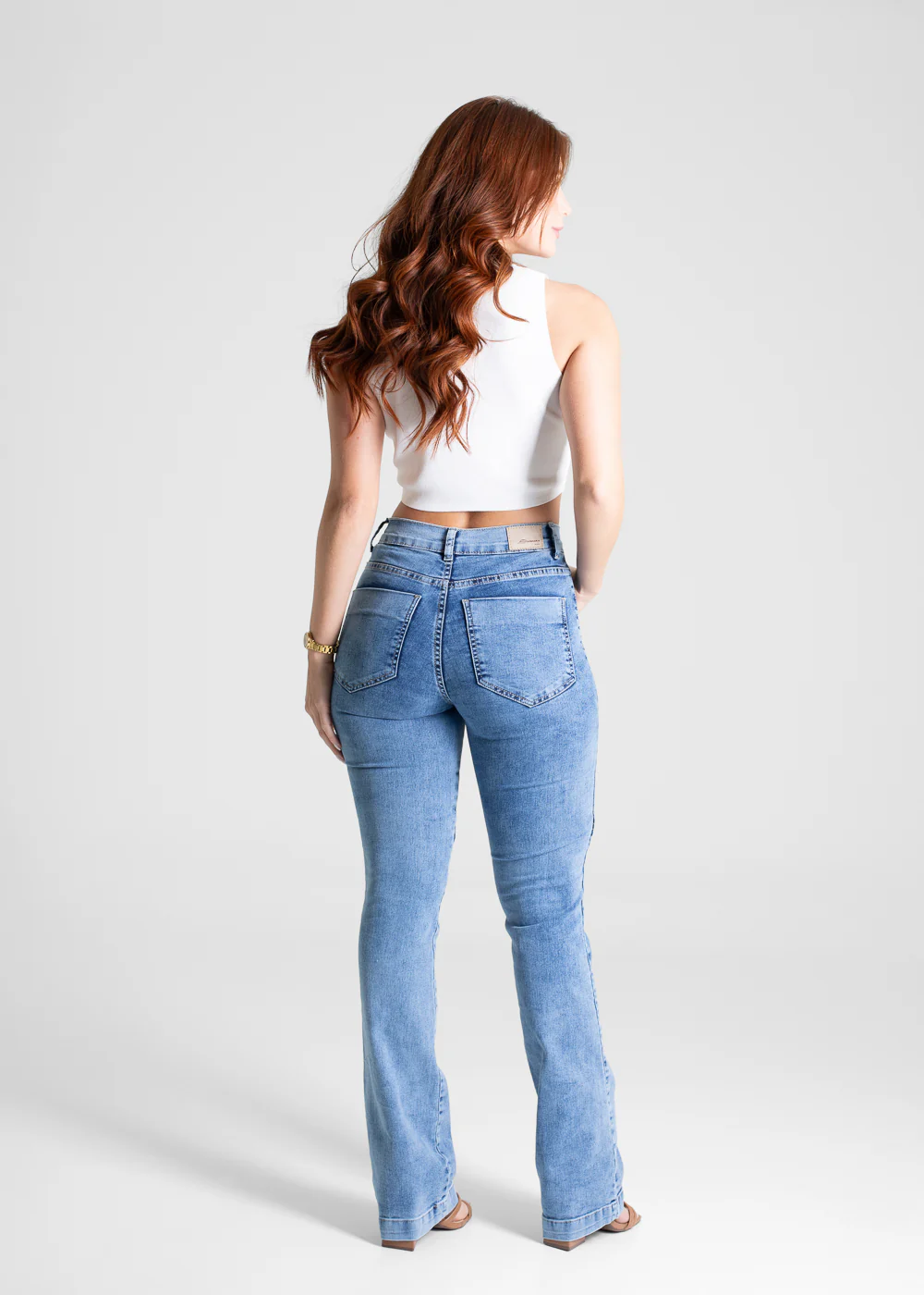A modelagem boot cut tem o caimento ajustado nas pernas e levemente ampla barra. Cintura media Fechamento com botão e zíper Bolsos frontais falsos e posteriores funcionais Barra simples Modelagem: boot cut Tecido: Jeans Tipo de lavagem: Azul Cor: Azul médio