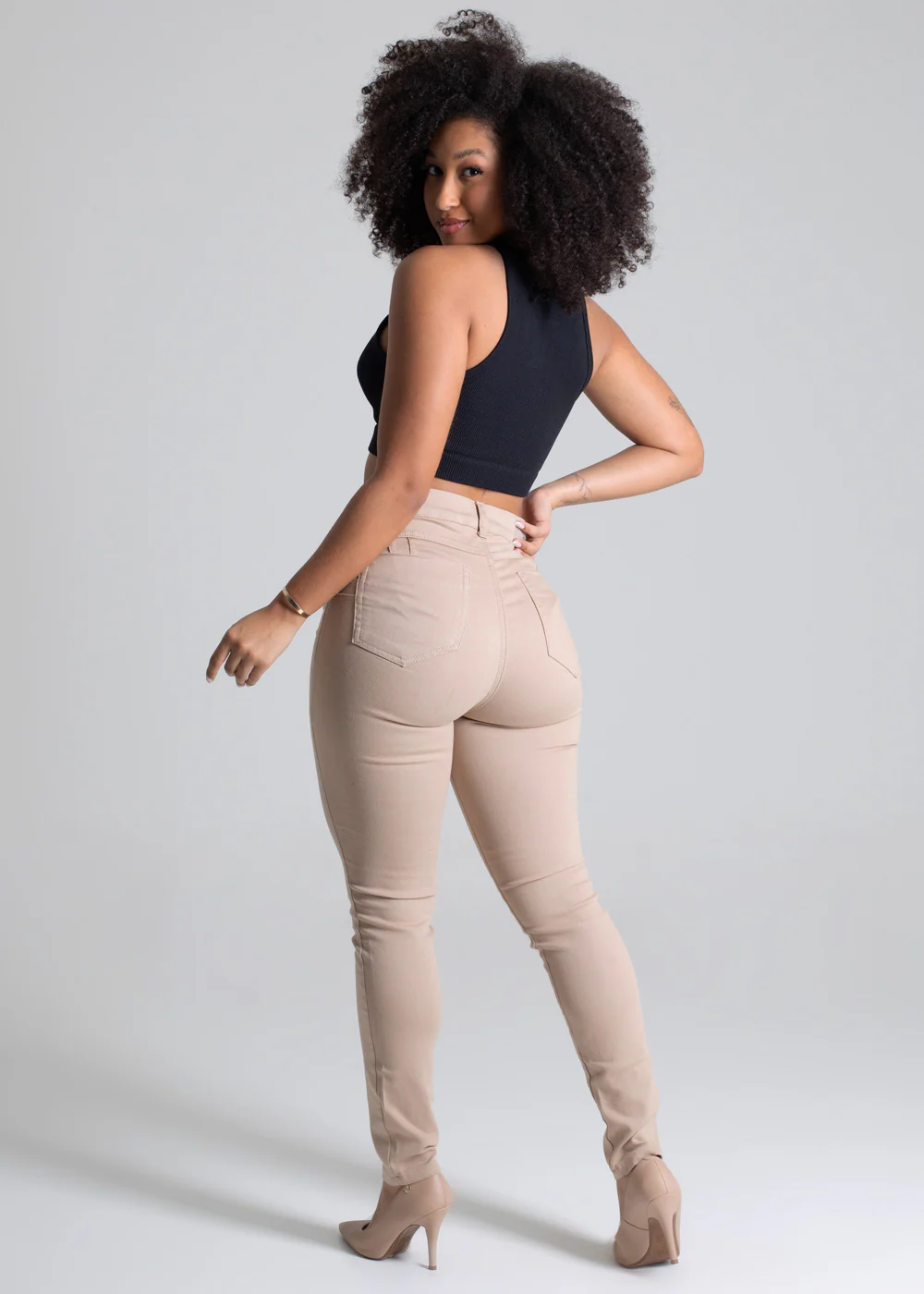 Calça levanta bumbum confeccionada em sarja. A modelagem tem quatro pences que valorizam as formas. Cintura médio Fechamento com botão metálico e zíper Bolsos frontais falsos e bolsos traseiros funcionais Barra simples Tecido: Sarja Tipo de lavagem: Color Cor: bege