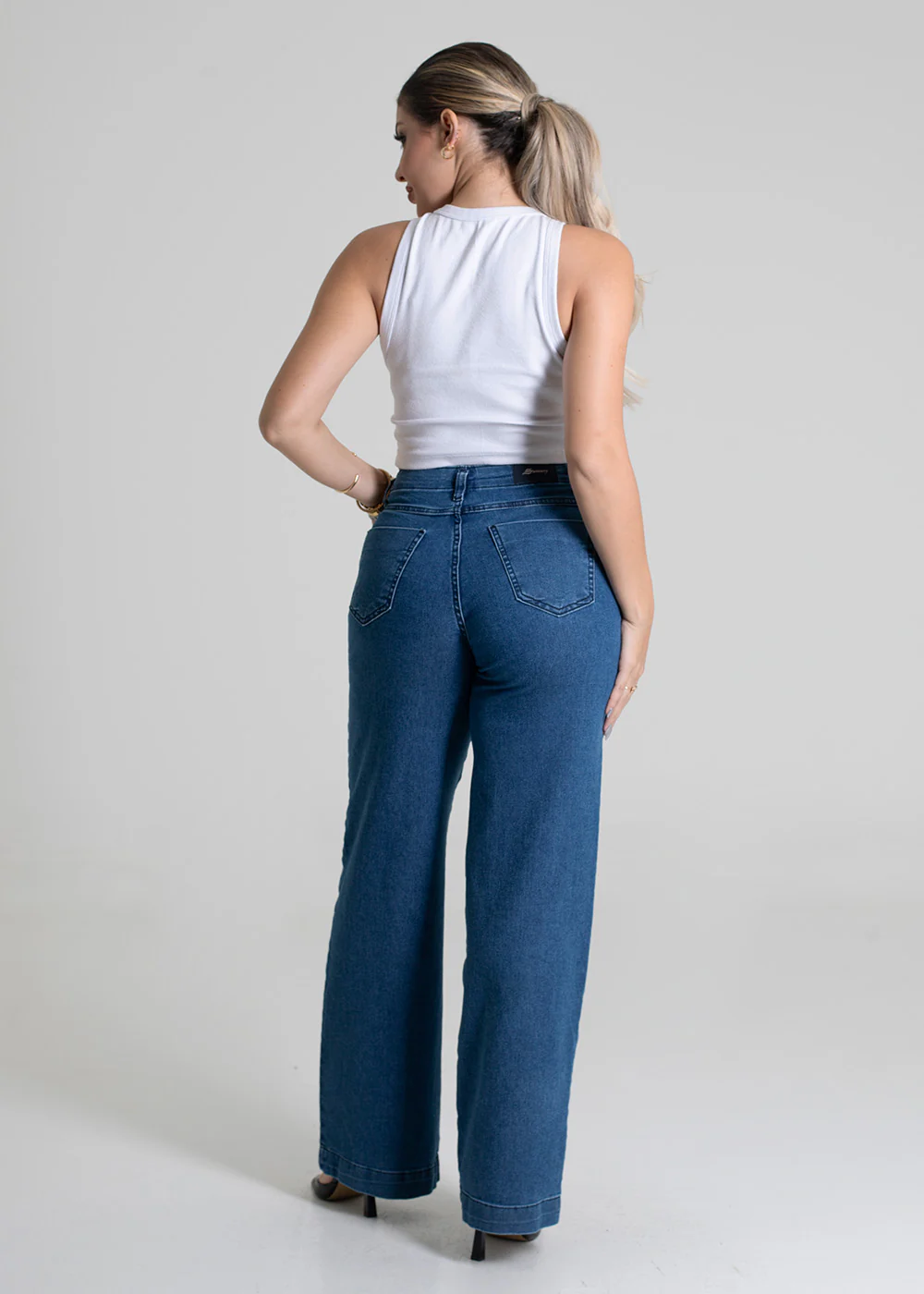 Calça feminina confeccionada em jeans. O modelo possui cintura super alta, gancho no lugar e caimento amplo da coxa até a barra. Cintura alta Fechamento através de um botão e zíper Bolsos frontais e posteriores funcionais Barra simples Tecido: Jeans Tipo de Lavagem: Azul Cor: Azul claro