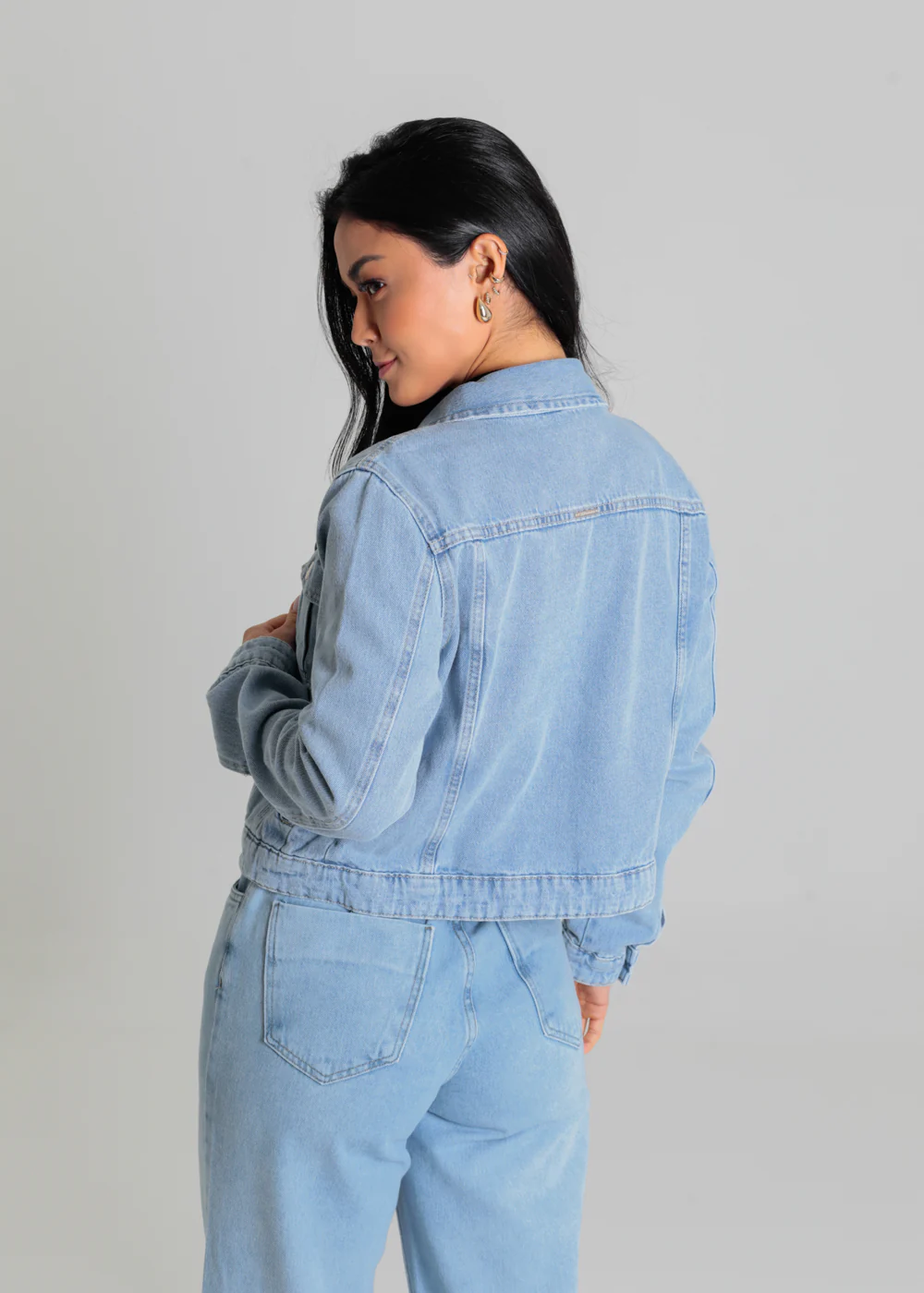 Detalhes Jaqueta confeccionada em jeans. Modelagem versåtil e atemporal Comprimento curto Fechamento com botão metålico Dois bolsos frontais funcionais Modelagem: Jaqueta Tecido: Jeans Tipo de lavagem: Azul Cor: Azul médio