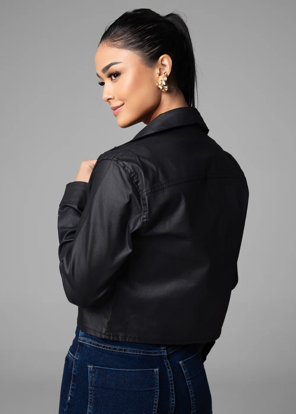 Jaqueta Resinada . Modelagem versátil e atemporal Comprimento curto Fechamento com botão metálico Dois bolsos frontais funcionais Modelagem: Jaqueta Tecido: Resinada Tipo de lavagem: Color Cor: preta